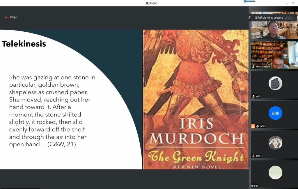 Miles Leeson教授的讲座立足默多克的哲学、小说与诗歌等不同体裁的创作,从默多克的“哥特小说”、默多克对“魔法与慰藉”的哲学论述、默多克日记与诗歌中的超自然书写、默多克小说中的“巫师与鬼魂”以及默多克对文学创作的思考等7个方面探讨了默多克对超自然现象的思索与呈现及其对文学艺术以及现实本质的深入思考。Miles Leeson教授的讲座生动有趣、内容丰富,既有相关理论与文学传统的耙梳,又有具体的文本细读。