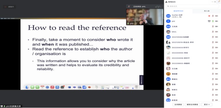 讲座探讨了后疫情时期高校在课程国际化过程中所面临的机遇与挑战,介绍了英国高校通过了解员工需求和创建特色课程来提高员工对学科的认识,培养他们将专业能力转化为就业能力、跨文化能力和团队合作能力;介绍了英国国内课程国际化的最新进展,讨论了基于合作关系的教育模式——本着互惠互利的原则的潜力,这种模式支持与其他国家合作进行线上和线下教学,使每所高校和员工群体得以相互学习。讲座还讨论了提升员工学术能力的关键策略与技巧,分享了采用何种技术来确保有效地进行现场会议记录,如何确保员工有效地独立完成学术阅读,并分析了学术写作和学术风格的特点等。