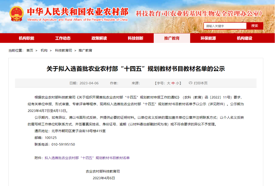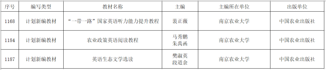 近日,农业农村部科技教育司公布了《关于拟入选首批农业农村部“十四五”规划教材书目教材名单的公示》,公司教师团队主编的《“一带一路”国家英语听力能力提升教程》、《农业政策英语阅读教程》、《英语生态文学选读》等3部教材入选。