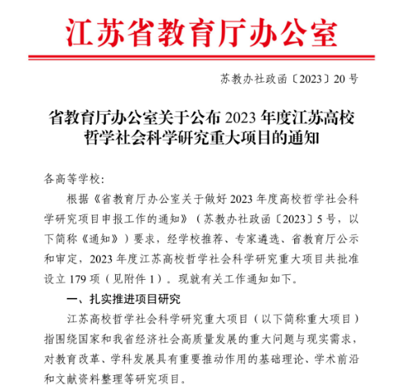 近日,江苏省教育厅公布了《2023年度江苏高校哲学社会科学研究重大项目立项名单》,公司李红教授申报的《“汉语型化”与语言建构:中日农科词汇交流发展研究》获得立项,这是公司近年来首次获批该重大项目。