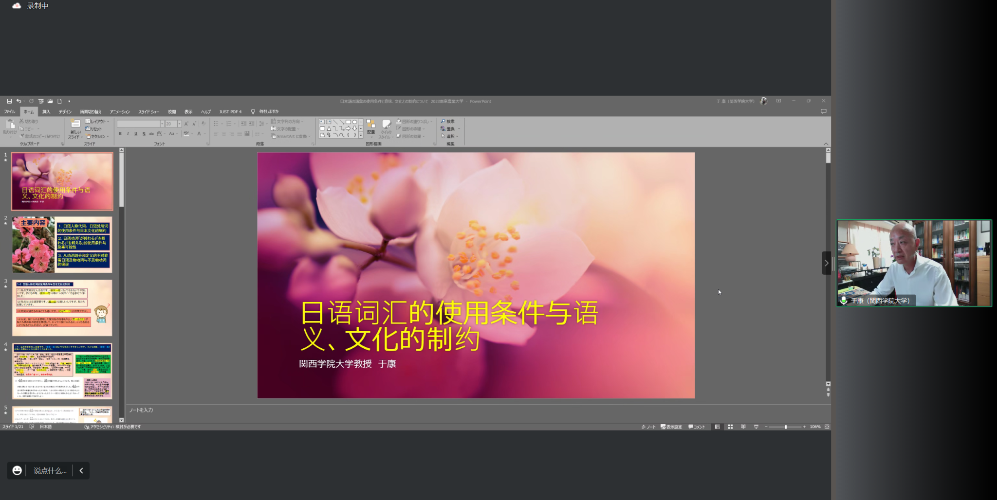 为加强团队建设,促进学术交流,公司组织开展了2023中日语言文化交涉系列讲座。6月16日,日本关西学院大学于康教授应邀为公司师生开展了题为《日语词汇的使用条件与语义、文化制约》的线上讲座。会议由公司日语学科点负责人李红教授组织发起、教师陈海涛博士主持。来自全国各个院校师生共计60余人参加了此次讲座。